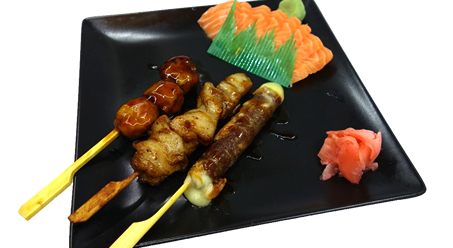 8 sashimi saumon ou 3 sushi saumon,3 yakitoris : 1 cuisse de poulet, 1 boulette de poulet et 1 boeuf fromage et riz blanc
