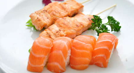 4 Sushi saumon, 2 brochettes de saumon, riz blanc