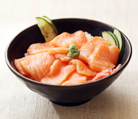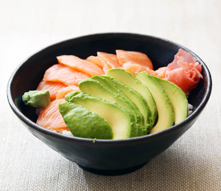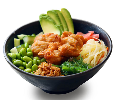 Riz vinaigre maison, nuggets de poulet japonais, avocat, carottes râpées, algues, concombre, edamame, choux blanc assaisonné, oignons frits, gingembre, sésames et sauce sucré ou salé