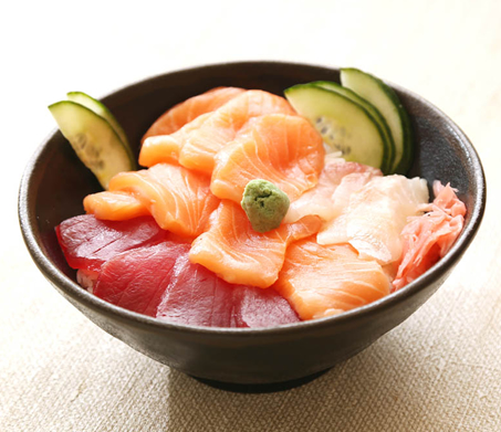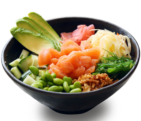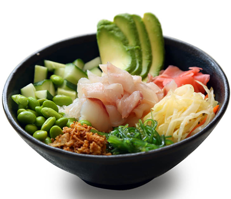 Riz vinaigre maison, dorade, avocat, carottes râpées, algues, concombre, edamame, chou blanc assaisonné, oignons frits, sésames gingembre, et sauce mayonnaise wasabi