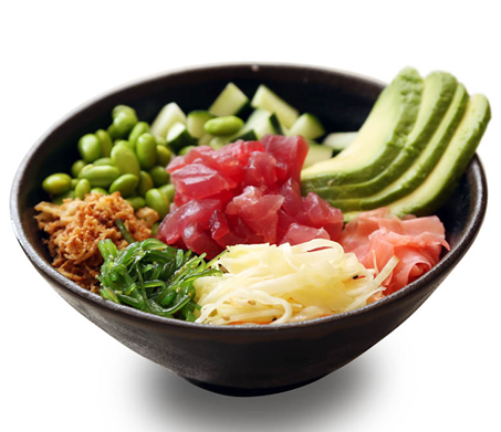Riz vinaigre maison, thon, avocat, carottes râpées, algues, concombre, edamame, chou blanc assaisonné, oignons frits, sésames gingembre, et sauce mayonnaise wasabi